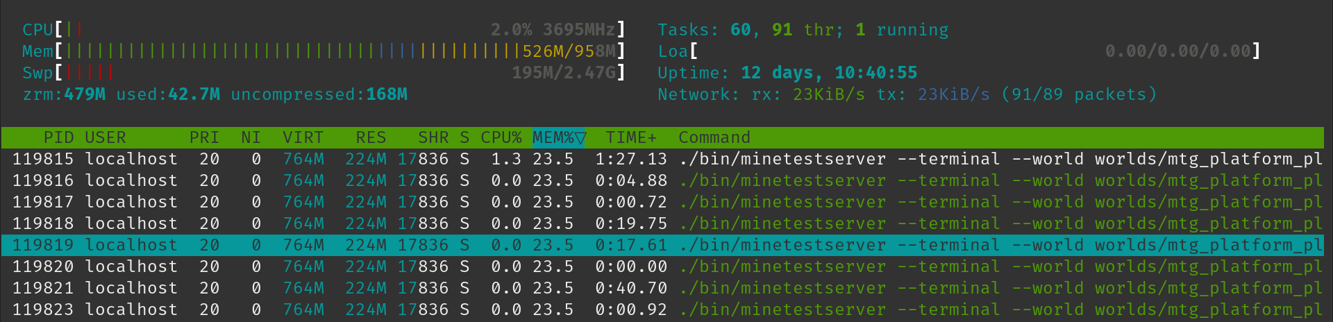 <localhost> also, 7 players on the server can feed ram, but zram and swap helps... (i'm tested before changes from it: https://forum.minetest.net/viewtopic.php?f=10&t=1825 |